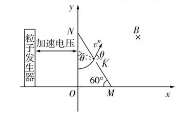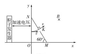 如图所示,在Oxy坐标系x>0,y>0区域内充满垂直纸面向里,磁感应强度大小为B的匀强磁场。磁场中放置一长度为L的挡板,其两端分别位于x、y轴上M、N两点,∠OMN=60°,挡板上有一小孔K位于MN中点。△OMN之外的第一象限区域存在恒定匀强电场。位于y轴左侧的粒子发生器在