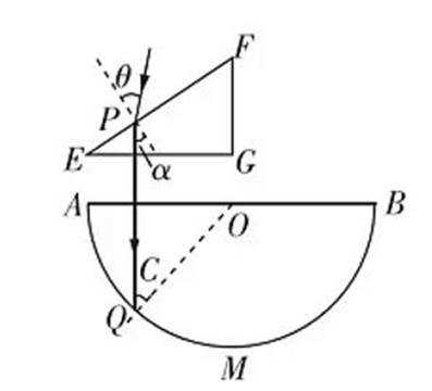 (2)根据题意作出单色光第一次到达半圆弧 AMB 恰好发生全反射的光路图如下所示。