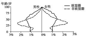 图1示意2015年欧盟境内欧盟籍和非欧盟籍的人口结构。据此完成4~5题。