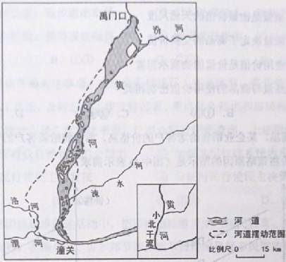 黄河小北干流是指黄河禹门口至潼关河段。全长132.5千米。该河段左岸有汾河、涑水河,右岸有渭河等支流汇入,河道摆动频繁,冲淤变化剧烈。为典型的堆积性游荡河道。图3为黄河小北干流河段示意图。据此完成9~11题。
