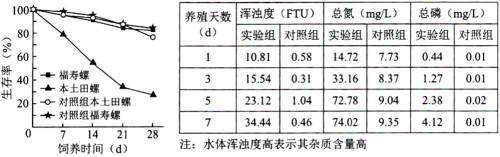 入侵生物福寿螺适应能力强、种群繁殖速度快。为研究福寿螺与本土田螺的种间关系及福寿螺对水质的影响,开展了以下实验: