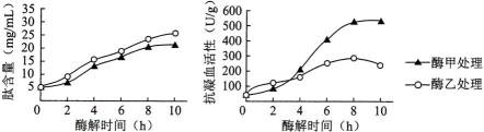 ⑶将提取的水蛭蛋白经甲、乙两种蛋白酶水解后,分析水解产物中的肽含量及其抗凝血活性,结果如图所示。推测两种处理后酶解产物的抗凝血活性差异主要与肽的______(填“种类”或“含量”)有关,导致其活性不同的原因是______________________________。