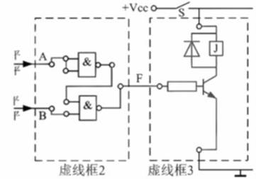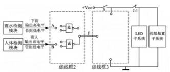 (4)为了节能,小明准备用继电器控制龙灯,当下雨或无观众时,机械装置子系统和LED子系统不工作。请帮助小明完成电路设计,在虚线框2中完成门电路的连接,其输出信号F作为虚线框3中电路的输入信号,并选择电阻、二极管、继电器及合适类型的三极管各一个,在虚线框3中用共发射极接法将电路补充完整。