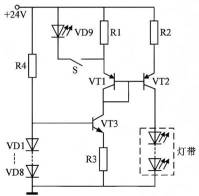 如图所示是小明设计的灯带电路模型,R1与R2、VT1与VT2参数相同,VD1-VD8为硅二极管。初始状态时,VT1、VT2、VT3均工作在放大区。下列分析中不正确的是( )