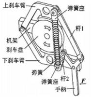 如图所示的刹车装置,刹车盘通过转轴安装在机架上,刹车臂、手柄通过销轴安装在机架上。手柄在力F的作用下转动,通过杆1和杆2带动上、下刹车臂抱紧刹车盘,从而实现刹车。撤去力F后,弹簧使装置复位。下列关于该刹车装置的分析,不正确的是( )