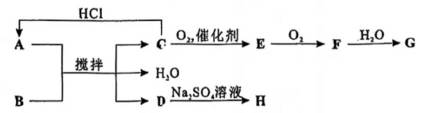 如图所示的物质转化关系中,固体A与固体B研细后混合,常温下搅拌产生气体C和固体D,温度迅速下降。气体C能使湿润的红色石蕊试纸变蓝。G是一种强酸。H是白色固体,常用作钡餐。下列叙述错误的是( )