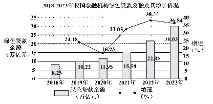 贷款余额是指在某一时间点上银行尚未收回的各类贷款本金总额,反映银行的信贷规模。截至2023年末,中国银行等六大国有银行的绿色贷款余额达17.86万亿元。图是2018-2023年我国金融机构绿色贷款余额及其增长情况。据材料,可以推断出( )