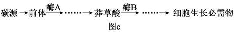 (4)莽草酸是一种重要工业化学品,其胞内合成代谢途径见图c。由于野生型大肠杆菌胞内酶A活性弱,且莽草酸会被快速转化为细胞生长必需物,因此细胞中无法大量积累莽草酸。为了保证细胞正常生长,并在生长稳定期实现莽草酸的大量积累,利用上述两种质粒的调控功能,结合野生型菌株遗传物质的改造,提出重组生产菌株构建思路:______。