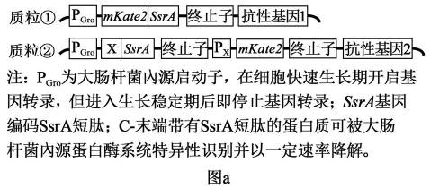 大肠杆菌是重要工业菌株之一,其培养过程可分为快速生长期和生长稳定期两个阶段。为了通过调节蛋白质合成与降解速率来动态调控代谢途径关键酶的蛋白量,使细胞适配不同阶段的生产需求,研究者设计了两种质粒,并以稳定性好的红色荧光蛋白mKate2为模式蛋白。测试质粒功能。回答下列问题: