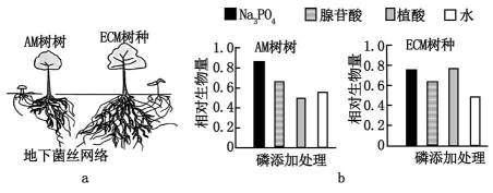 热带雨林土壤中磷元素大部分以植物不能直接吸收利用的复杂有机磷形式存在,是植物生长和幼苗更新的主要限制因素。热带雨林中绝大多数植物都与菌根真菌形成互利共生关系,菌根真菌为植物提供矿质元素和水分,并从宿主植物获得生长必需的碳水化合物,其中,乔木主要与丛枝菌根(AM)或外生菌根(ECM)真菌共生(图a)。为探究AM和ECM真菌对宿主植物磷元素吸收的作用,科学家选取AM和ECM树种开展盆栽实验,向接种菌根真菌后的幼苗分别提供