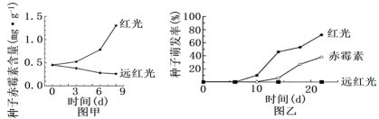 为研究红光、远红光及赤霉素对莴苣种子萌发的影响,研究小组进行黑暗条件下莴苣种子萌发的实验。其中红光和远红光对莴苣种子赤霉素含量的影响如图甲所示,红光、远红光及外施赤霉素对莴苣种子萌发的影响如图乙所示。