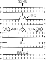 紫外线引发的DNA损伤,可通过“核苷酸切除修复(NER)”方式修复,机制如图所示。着色性干皮症(XP)患者的NER酶系统存在缺陷,受阳光照射后,皮肤出现炎症等症状。患者幼年发病,20岁后开始发展成皮肤癌。下列叙述错误的是( )