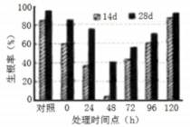 BA对苹果丛状苗生根的影响如图所示。对照组为〃MS培养基+NAA〃,实验组分别选取在对照组为“MS培养基+NAA"培养了Oh、24h、48h、72h、96h、120h的丛壮苗,用“MS培养基+NAA+BA”各处理24h后,再转入"MS培养基+NAA”继续培养。各组都在丛状苗培养的第14d和第28d观察并统计生根率,NAA和BA的浓度均为