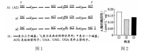 故al发生碱基对的替换a2发生碱基对的增添,都提前出现了终止密码子,导致多肽变短。故突变个体酶活性降低,野生型最高,故野生型是①.