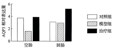 研究人员对小鼠进行致病性大肠杆菌接种,构建腹泻模型。用某种草药进行治疗,发现草药除了具有抑菌作用外,对于空肠、回肠黏膜细胞膜上的水通道蛋白3(AQP3)的相对表达量也有影响,结果如图所示。下列叙述正确的是( )