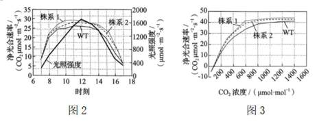 (3)我国科学家将改变光呼吸的相关基因转入某种农作物野生型植株(WT),得到转基因株系1和2,测定净光合速率,结果如图2、图3。图2中植物光合作用
