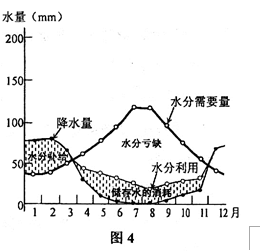 从图中可以看出,该地在4-11月降水少,但水分需要量大,水分亏缺大,水分利用主要消耗的是储存谁,而11-3月降水多,水分需求量少,水分储存。表明该地有“雨热不同期”的特点,因此可以判断该地为地中海气候。