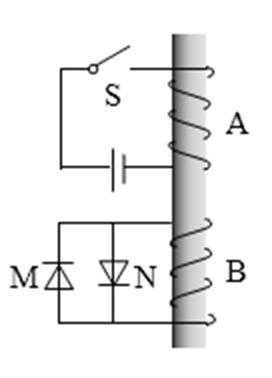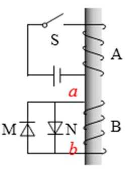 7.如图所示,铁芯上有两个线圈A和B.线圈A跟电源相连,LED(发光二极管,具有单向导电性)M和N并联后接线圈B两端.图中所有元件均正常,则( )
