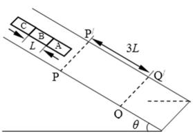 16.如图所示,倾角为θ的斜面上PP/、QQ/之间粗糙,且长为3L,其余部分都光滑.形状相同、质量分布均匀的三块薄木板A、B、C沿斜面排列在一起,但不粘接.每块薄木板长均为L,质量均为m,与斜面PP/、QQ/间的动摩擦因素均为2tanθ.将它们从PP/上方某处由静止释放,三块薄木板均能通过QQ/.重力加速度为g.求: