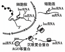 (3)转录后加工产生的lncRNA、miRNA参与基因的表达调控。据图分析,lncRNA调控基因表达的主要机制有______(2分)miRNA与AGO等蛋白结合形成沉默复合蛋白,引导降解与其配对结合的RNA。据图可知,miRNA发挥的调控作用有______(2分)。