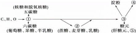 ①、②、③依次代表单糖、二糖、多糖,单糖不可继续水解,A错误;①为单糖属还原糖,在加热条件下与斐林试剂发生反应将产生砖红色沉淀,②中蔗糖不是还原性糖,③多糖均是非还原性糖,B错误;④为纤维素,是植物细胞壁的主要成分,说明多糖也可以参与细胞结构的形成,C正确;④、⑤分别为纤维素、肌糖原,肌糖原可贮存能量,可作为贮能物质,纤维素只能构成植物细胞壁的成分,D错误。