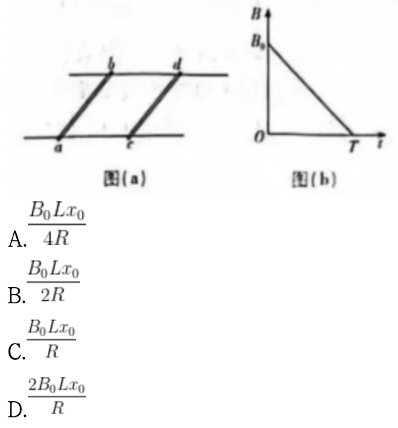 如图(a)所示,相距L的两足够长平行金属导轨放在同一水平面内,两长度均为L、电阻均为R的金属棒ab、cd垂直跨放在两导轨上,金属棒与导轨接触良好,导轨电阻忽略不计。导轨间存在与导轨平面垂直的匀强磁场,其磁感应强度大小B随时间变化的图像如图(b)所示,t=T时刻,B = 0。t=0时刻,两棒相距