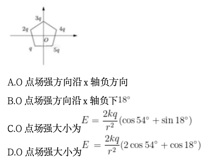 如图所示,在xOy平面内有一以O点为中心的正五边形,顶点到O点的距离为R。在正五边形的顶点上顺时针方向依次固定电荷量为q、2q、3q、4q、5q的正点电荷,且电荷量为3q的电荷在y轴正半轴上,静电力常量为k,则O点处的电场强度( )