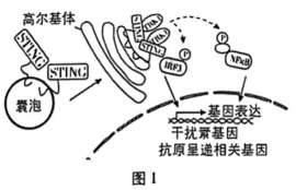 (11分)人体具有自我防御能力,能抵御病原体的侵袭。干扰素基因刺激因子(STING)是人体免疫功能的关键参与者,细胞中STING转运到高尔基体后,可激活STING信号通路,促进免疫相关基因的表达,如图1所示。请回答下列问题: