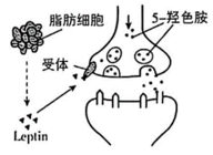 脂肪细胞分泌的生物活性蛋白Leptin可使兴奋性递质5-羟色胺的合成和释放减少,阻碍神经元之间的兴奋传递,如图所示。下列相关叙述错误的是( )