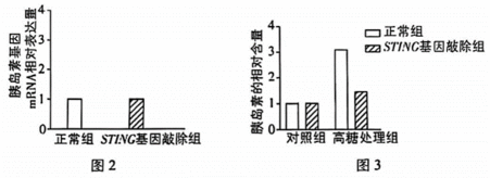 ②为探究胰岛B细胞中STING缺失与胰岛B细胞功能异常的关系,研究人员以正常小鼠和胰岛B细胞中STING基因敲除的小鼠为研究对象,分别分离了胰岛B细胞,开展两组实验:一组检测细胞中胰岛素基因的表达量,结果见图2;另一组用高糖溶液刺激,检测培养液中胰岛素的含量,结果见图3。根据图2、图3可得出结论:________________________________________________________________________(2分)。