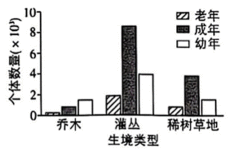 某岛屿上分布一种特有的爬行动物,以多种候鸟为食,候鸟主要栖息在灌丛和稀树草地。图示该爬行动物在不同生境下的年龄组成,下列相关叙述正确的有( )