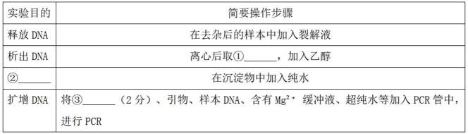 (3)研究者为了进一步研究川金丝猴的食性,采集其粪便样本,进行DNA提取、扩增,部分实验过程如下。请完成下表: