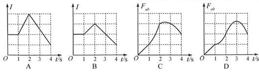 12.如图所示,平面直角坐标系的第一和第二象限分别存在磁感应强度大小相等、方向相反且垂直于坐标平面的匀强磁场,图中虚线方格为等大正方形。一位于Oxy平面内的刚性导体框abcde在外力作用下以恒定速度沿y轴正方向运动(不发生转动)。从图示位置开始计时,4 s末bc边刚好进入磁场。在此过程中,导体框内感应电流的大小为I, ab边所受安培力的大小为Fab,二者与时间t的关系图像,可能正确的是