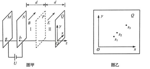 17.(14分)某型号质谱仪的工作原理如图甲所示。M、N为竖直放置的两金属板,两板间电压为U, Q板为记录板,分界面P将N、Q间区域分为宽度均为d的I、I两部分,M、N、P、Q所在平面相互平行,a、b为M、N上两正对的小孔。以a、b所在直线为z轴, 向右为正方向,取z轴与Q板的交点O为坐标原点,以平行于Q板水平向里为x轴正方向,竖直向上为y轴正方向,建立空间直角坐标系Oxyz。区域I、Ⅱ内分别充满沿x轴正方向的匀强磁场和匀强电场,磁感应强度大小、电场强度大小分别为B和E。一质量为m,电荷量为+q的粒子,从a孔飘入电场(初速度视为零),经b孔进入磁场,过P面上的c点(图中未画出)进入电场,最终打到记录板Q上。不计粒子重力。