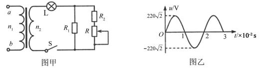 5.图甲中的理想变压器原、副线圈匝数比n1:n2=22:3,输入端a、b所接电压u随时间t的变化关系如图乙所示。灯泡L的电阻恒为15 Ω,额定电压为24 V。定值电阻R1=10 Ω、R2=5 Ω, 滑动变阻器R的最大阻值为10 Ω。为使灯泡正常工作,滑动变阻器接入电路的电阻应调节为