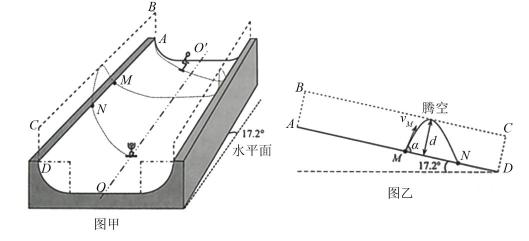 16.(9分)单板滑雪U型池比赛是冬奥会比赛项目,其场地可以简化为如图甲所示的模型: U形滑道由两个半径相同的四分之一圆柱面轨道和一个中央的平面直轨道连接而成,轨道倾角为17.2°。某次练习过程中,运动员以vM=10 m/s的速度从轨道边缘上的M点沿轨道的竖直切面ABCD滑出轨道,速度方向与轨道边缘线AD的夹角α=72.8°,腾空后沿轨道边缘的N点进入轨道。图乙为腾空过程左视图。该运动员可视为质点,不计空气阻力,取重力加速度的大小g=10 m/s2, sin72.8°=0.96,cos72.8°=0.30。求:
