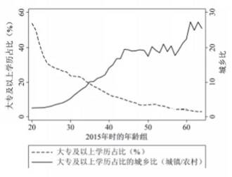 材料一 教育是积累人力资本的主要途径之一。右图给出了2015年中国1%人口抽样调查中的高等教育覆盖率数据。左纵轴表示各年龄段人口中拥有大专及以上学历者的占比,右纵轴表示城镇和农村地区这一占比的比值。