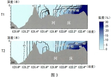 第五小题:根据盐度空间分布状况,可以了解河海相互作用状况。图3T1时期体现河海 (单选:A.充分融合 B.部分融合)状况,T2发生在长江的 (单选:A.洪水期 B.枯水期)。