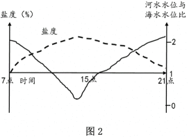材料三 图1为青草沙水库位置及某次咸潮入侵路径图,图2为长江口某日7点-21点盐度与河水相对水位变化曲线图,图3为某日长江口T1、T2时刻盐度空间分布图。