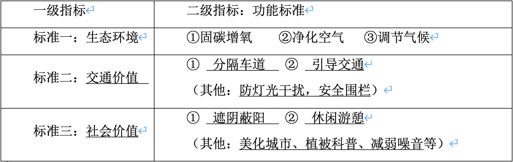 洛杉矶欲拟种某一种行道树,现要对该行道树功能进行多个指标的分析,请你填写两个一级指标、每个一级指标对应两个二级指标。