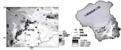 材料二 图1 清平镇简图,图2 清平镇在大熊猫国家公园的位置图
