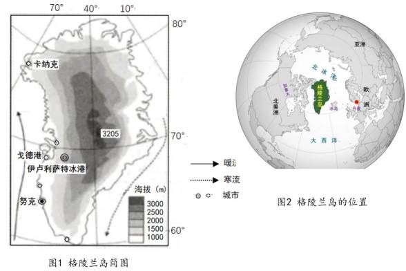 材料一 格陵兰岛为世界第一大岛屿,80%的面积被冰盖覆盖。冰盖是面积超过五万平方千米的冰川体,通常为穹形,冰盖会缓慢移动。冰盖对全球气候、大气环流、海平面产生重大影响。近年来,格陵兰岛冰川加速融化,引起了全球各地的注意。