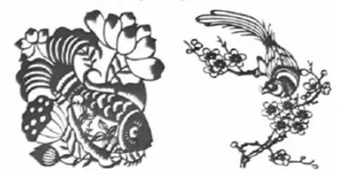 (4)剪纸是我国传统民间艺术,常用具体的形象表达纳福迎祥的寓意。请从下面剪纸画中任选一幅,说明其寓意,并从图画构成和谐音两方面进行简单解释。(4分)