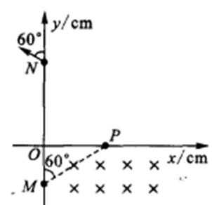 16.在如图所示的直角坐标系中,第四象限内有互相正交的匀强电场E与匀强磁场B1,一质量m=1×10-14kg.电荷量q=1×10-10C的带正电微粒以某一速度v沿与y轴正方向60°角从M点沿直线运动,M点的坐标为(0,-10),E的大小为0.5×103V/m,B1大小为0.5 T;粒子从x轴上的P点进入第一象限内,第一象限的某个矩形区域内,有方向垂直纸面向里的匀强磁场B2,一段时间后,粒子经过y轴上的N点并与y轴正方向成60°角的方向飞出,N点的坐标为(0,30),不计粒子重力,g取10m/s2.