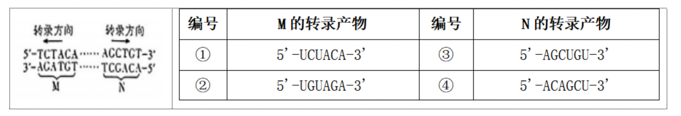 M和N是同一染色体上两个基因的部分序列,其转录方向如图所示。表中对M和N转录产物的碱基序列分析正确的是( )