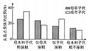 僧帽蚤接触到天敌昆虫的气味分子(利它素)后,头盔会明显增大,从而降低被天敌昆虫捕食的风险。如图所示,僧帽蚤母本和子代接触利它素的情况不同,对子代头盔占身体比例的影响具有明显差异。下列分析错误的是( )