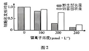 (4)将转基因衣藻和野生型衣藻在不同镉离子浓度的培养液中培养6天后,检测细胞密度,结果见图2。转基因衣藻在含有不同浓度镉离子的培养液中生长均优于野生型衣藻的原因可能是________________________。240μmol·L-1镉离子浓度下,转基因衣藻和野生型衣藻生长均被明显抑制的原因可能是____________________。