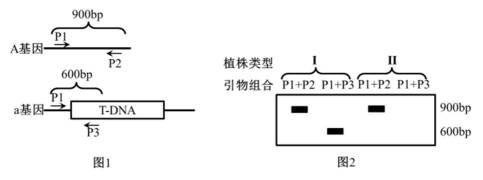 (3)为进一步验证基因A的功能,将另一个A基因插入Au植株的3号染色体。仅考虑基因A和a,该植株会产生__________种基因型的可育花粉,其中具有a基因的花粉占比为__________。该植株自交得到F1。利用图1所示引物P1和P2、P1和P3分别对F1进行PCR检测,电泳结果如图2所示。根据电泳结果F1植株分为Ⅰ型和Ⅱ型,其中Ⅰ型植株占比为__________。F1中没有检测到仅扩增出600bp条带的植株,其原因为__________________________________________________________________________。