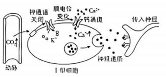 血液中CO2浓度升高刺激Ⅰ型细胞,由此引发的Ca2+内流促使神经递质释放,引起传入神经兴奋,最终使呼吸加深加快。通过Ⅰ型细胞对信息进行转换和传递的通路如图所示。下列叙述错误的是( )