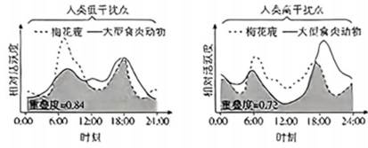 (3)如果大型食肉动物和梅花鹿每天的活动次数不变,据上图所示,从重叠度角度分析人类高干扰对大型食肉动物的影响是______________________________。